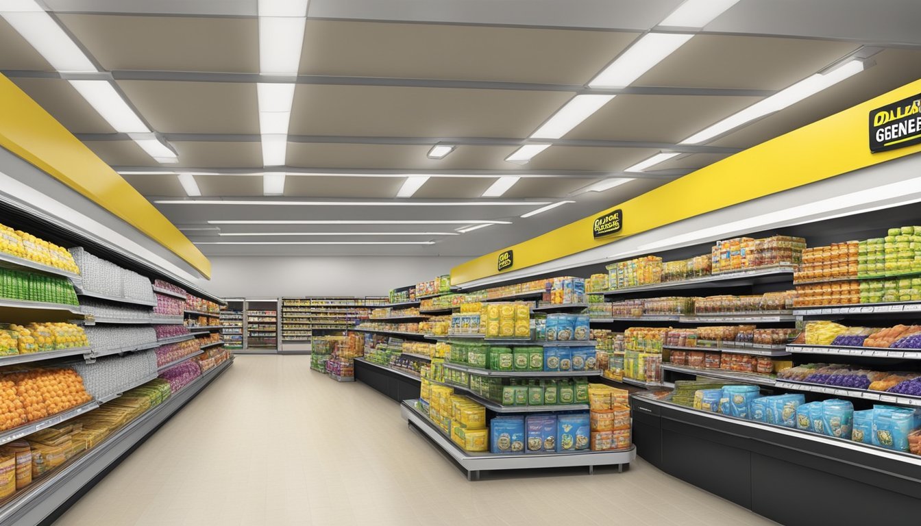 Both retailers stock essential grocery items and household staples. Dollar General focuses on shelf-stable packaged foods, offering a variety of canned goods, pasta, and snacks. They also carry household necessities like trash bags and cleaning supplies.