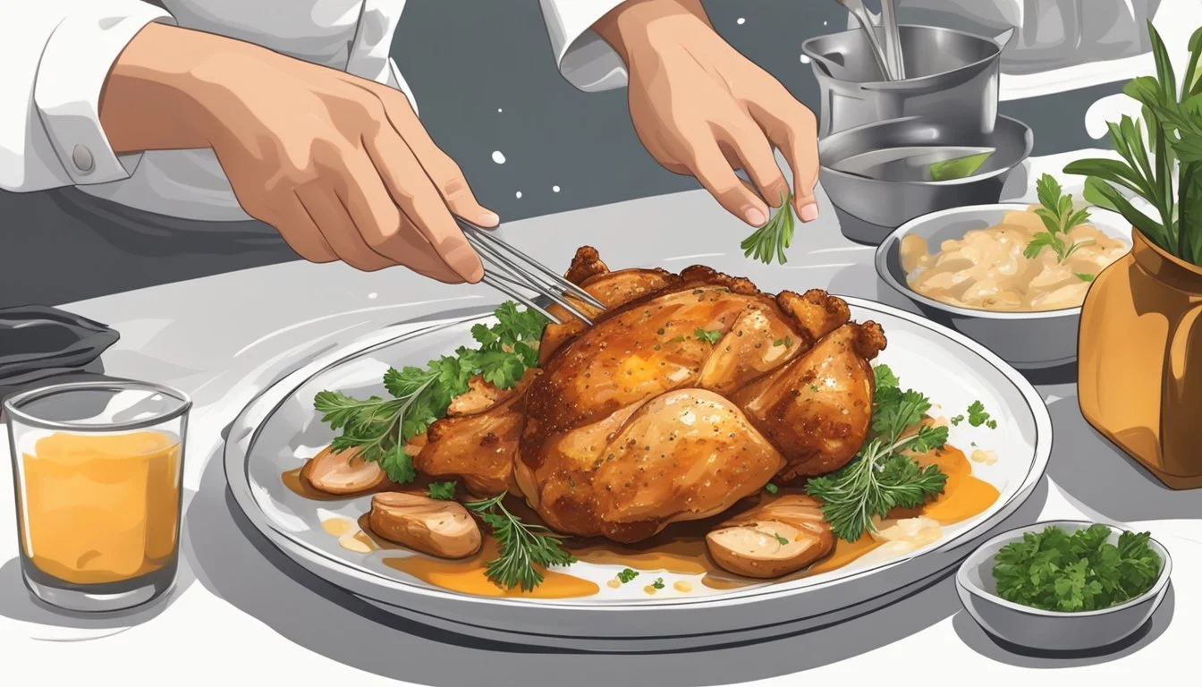 Add height to the plate by stacking vegetables or placing the chicken atop a bed of rice. Drizzle any pan juices over the meat just before serving to enhance its appearance and flavor. Use white or light-colored plates to make the golden-brown chicken stand out.