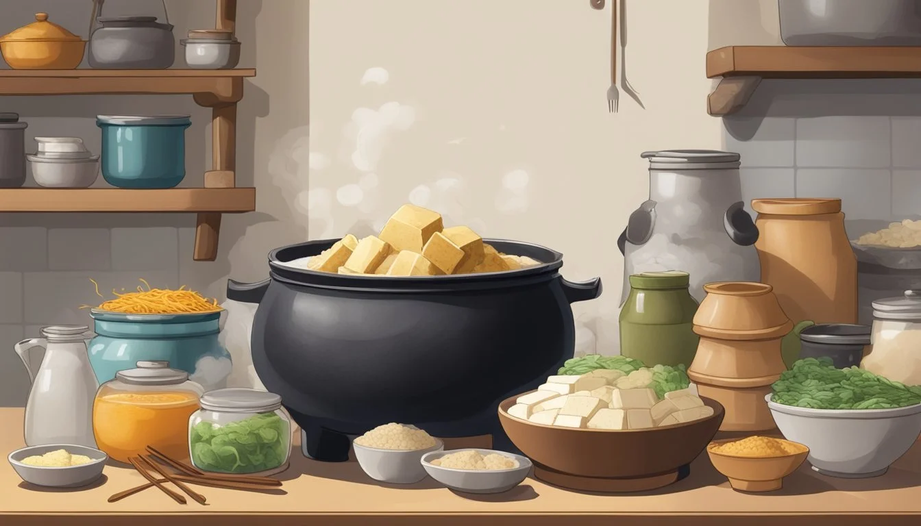A Stinky Tofu Hot Pot is a warming dish perfect for cooler weather. The foundational recipe involves a rich, simmering broth seasoned with aromatics and spices such as star anise and sichuan peppercorns for a spicy undertone. Thinly sliced pork and tender bamboo shoots complement cubes of fermented tofu, melding all the flavors together in a harmonious hot pot that is both savory and satisfying.