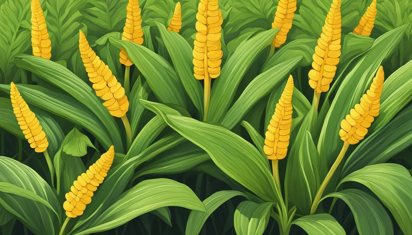 Curcuma longa, or turmeric, is a rhizomatous herbaceous perennial plant. It is known for its robust rhizomes, which are the source of the spice. These rhizomes are usually boiled, dried, and then ground into the familiar golden-yellow powder. Turmeric plants are identifiable by their large, luscious green leaves and funnel-shaped flowers that range in color from white to yellow and pink.