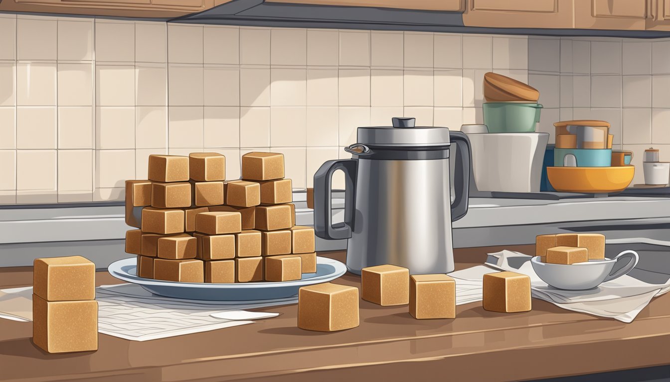 Keeping brown sugar cubes fresh involves controlling their exposure to air and moisture. For additional protection against hardening, a sugar saver or a small piece of apple wedge or orange peel can be added to the container—this helps to moderate moisture levels. These items should be checked and replaced regularly to avoid spoilage that could affect the sugar.