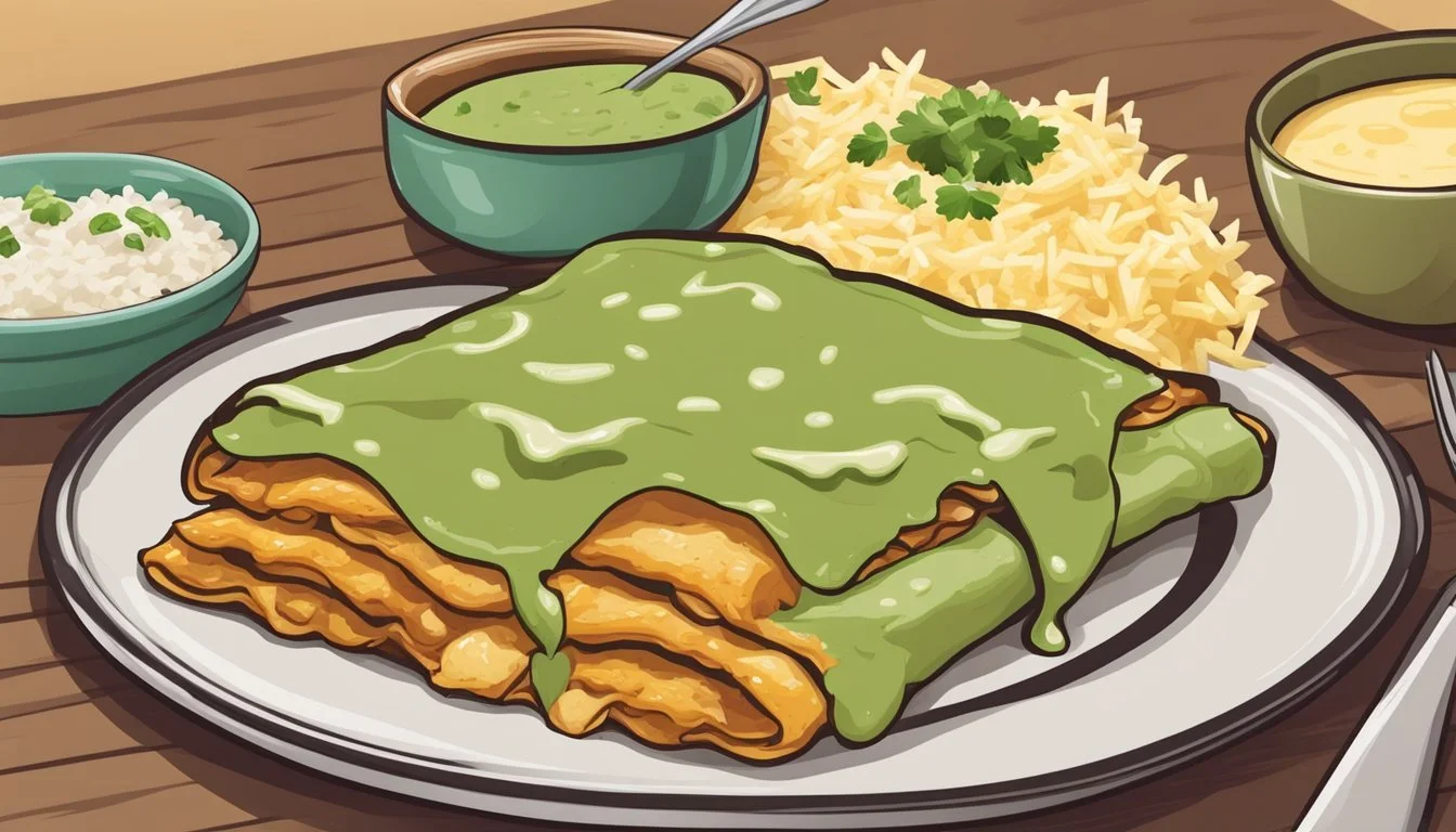 A key component of Enchiladas Suiza is the Suiza sauce, a mixture of tomatillo sauce, cilantro, lime juice, and salt. The sauce is cooked until it reaches a smooth consistency and is then combined with sour cream to add richness.