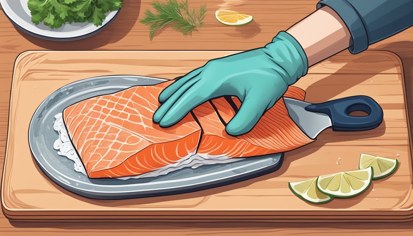 Keeping raw salmon separate from other foods to avoid cross-contamination