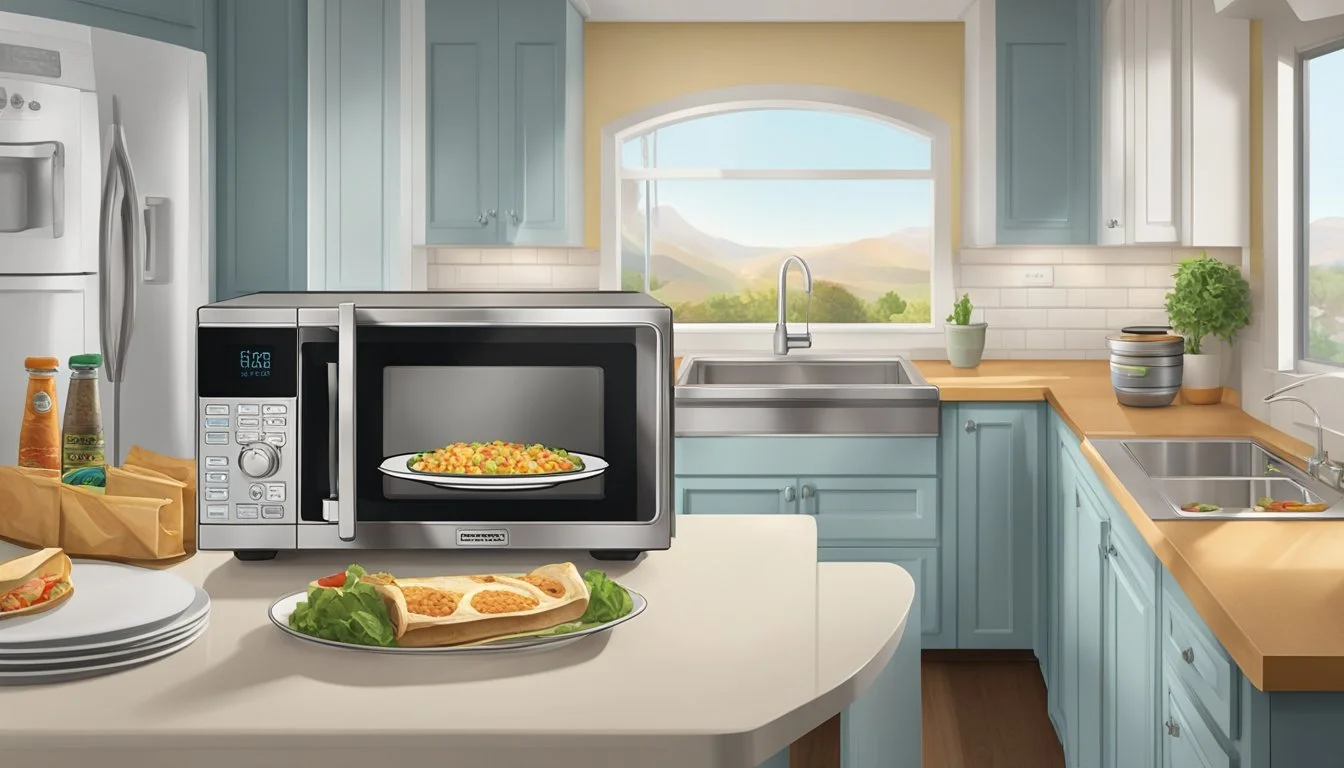 Reheating in the microwave is quick and convenient. Begin by unwrapping the burrito and placing it on a microwave-safe plate. Cover it with a damp paper towel to keep it moist and prevent it from drying out. Set the microwave to 50% power or use the defrost setting, if available. Heat the burrito for 2 minutes. Allow it to sit for 45 seconds in the closed microwave to let the heat distribute evenly. Flip the burrito and heat it for an additional minute to ensure it is fully warmed through.