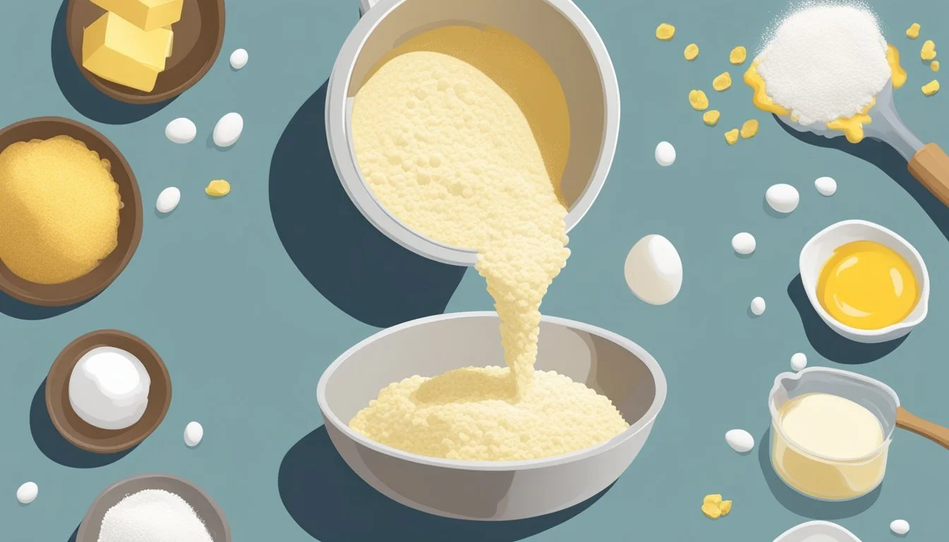 In another, combine wet ingredients — such as milk, egg yolks, and melted unsalted butter — ensuring that the butter is cooled to avoid cooking the eggs.