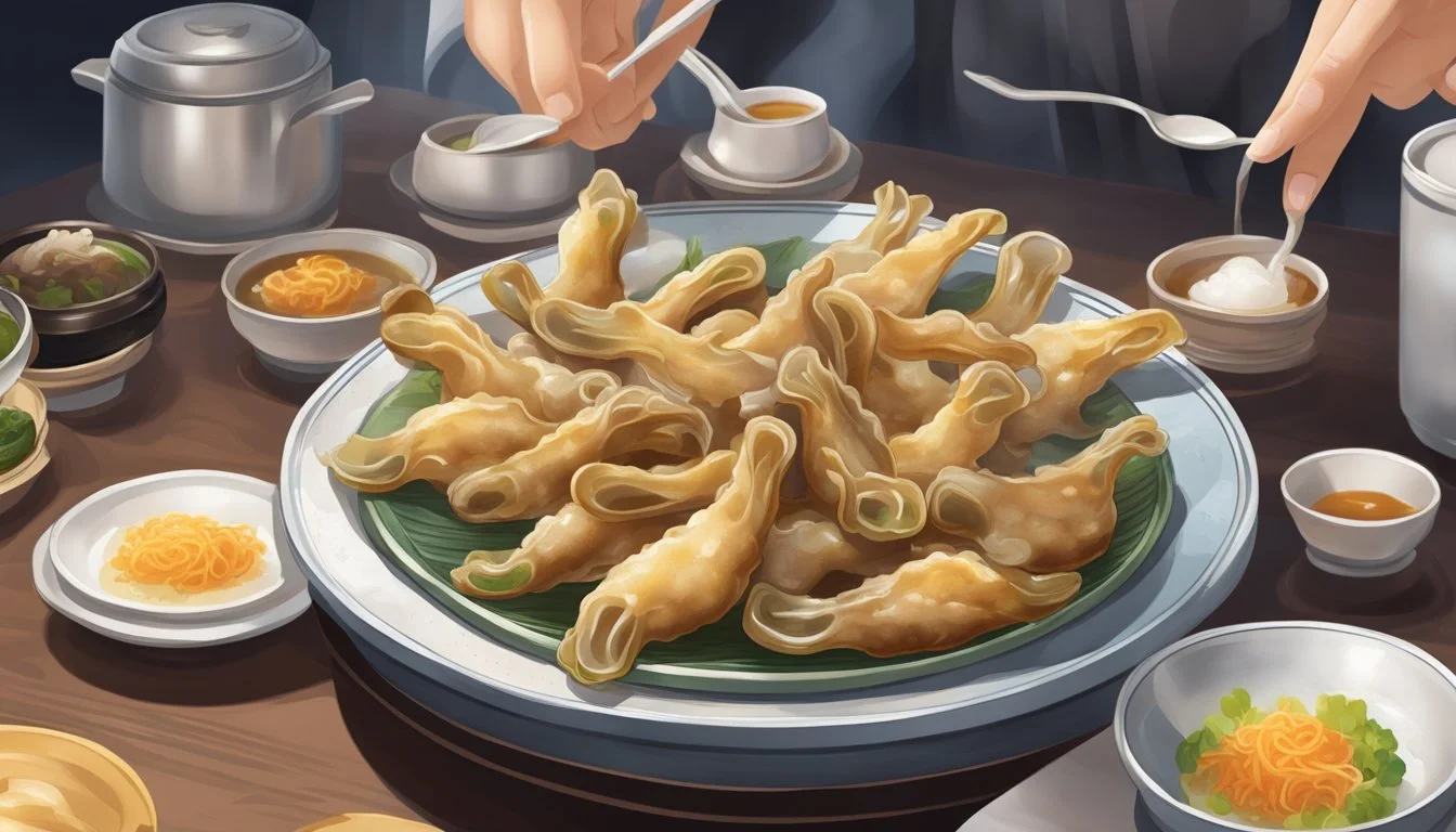 Once tender, the duck feet are coated lightly with cornstarch, which provides a slight thickness to the surrounding sauce upon heating. This addition contributes to the gelatinous texture that's characteristic of the dish. The duck feet can then be artfully arranged on the serving plate, ready for presentation.