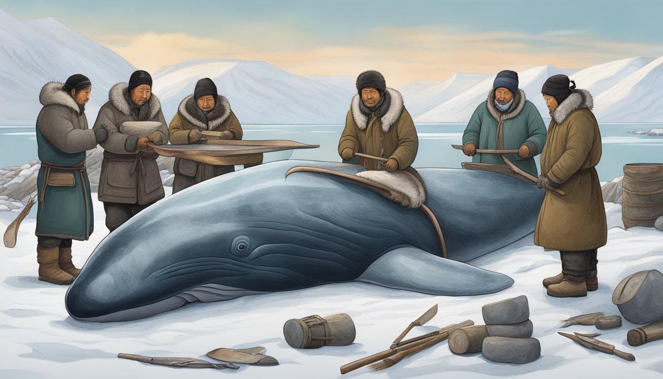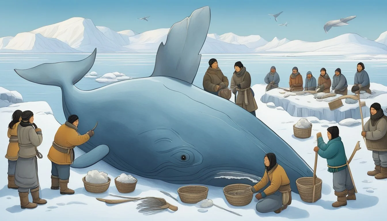 Inuit hunters use specialized tools and techniques to harvest whales such as the beluga and bowhead, adhering to ancient practices passed down through generations. Hunting for these whales is carried out during specific seasons when the sea ice allows access. Following a successful hunt, utilitarian efficiency dictates the extraction of muktuk, with meticulous care taken to honor the animal by using as much of it as possible.