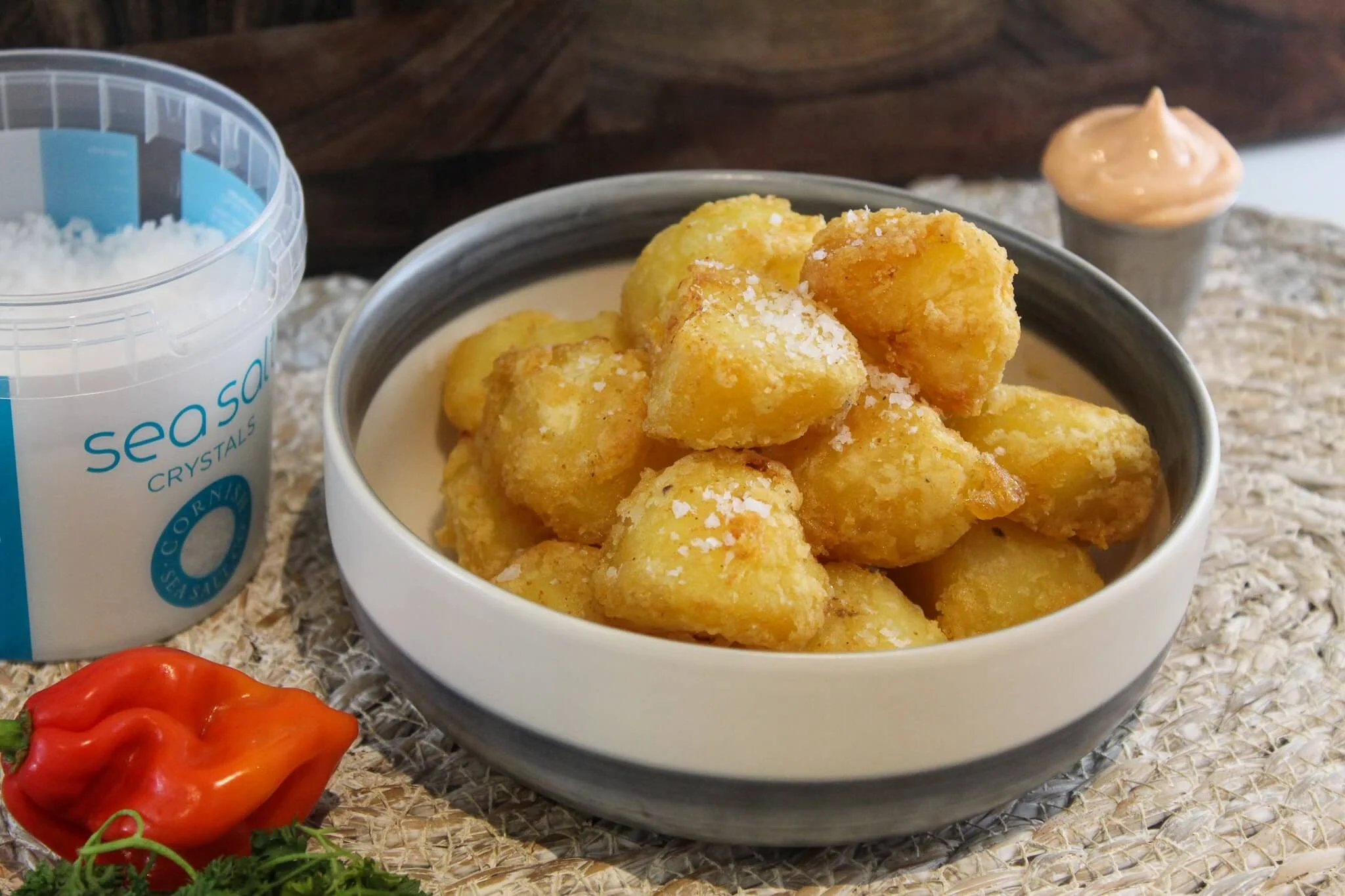 Drop the potato quarters into salted boiling water and boil the potatoes for 7-8 minutes until just the outside are softened up. Drain the potatoes in a colander and give them a really good shake in there so that the outside of the quarters fluff up. In a separate small bowl combine a couple of tablespoons of plain flour, some salt, and some pepper then durst them over the potatoes and give them a shake to evenly distribute the flour (how long does flour last?).