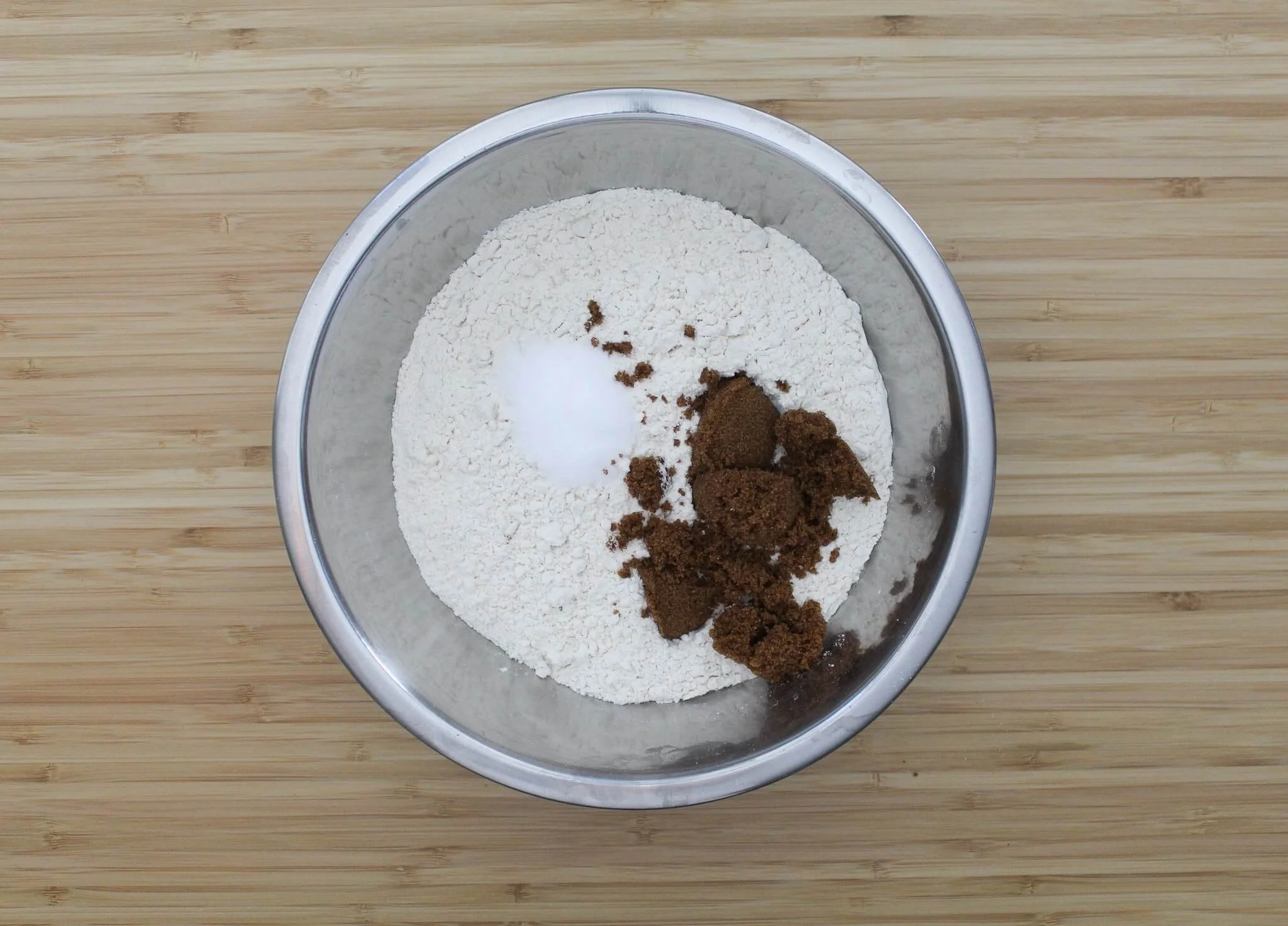 - Start the dough by combining 4 cups of bread flour with 3 tablespoons or brown sugar and 2 teaspoons fine sea salt in a large mixing bowl.