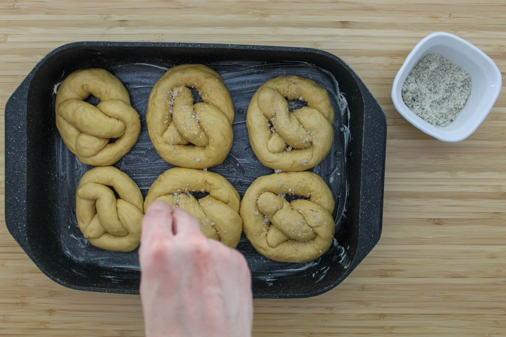 - For around 20-30 seconds, making sure the whole pretzel is submerged. Remove them onto a parchment paper-lined baking tray, sprinkle with coarse salt and bake in the oven.