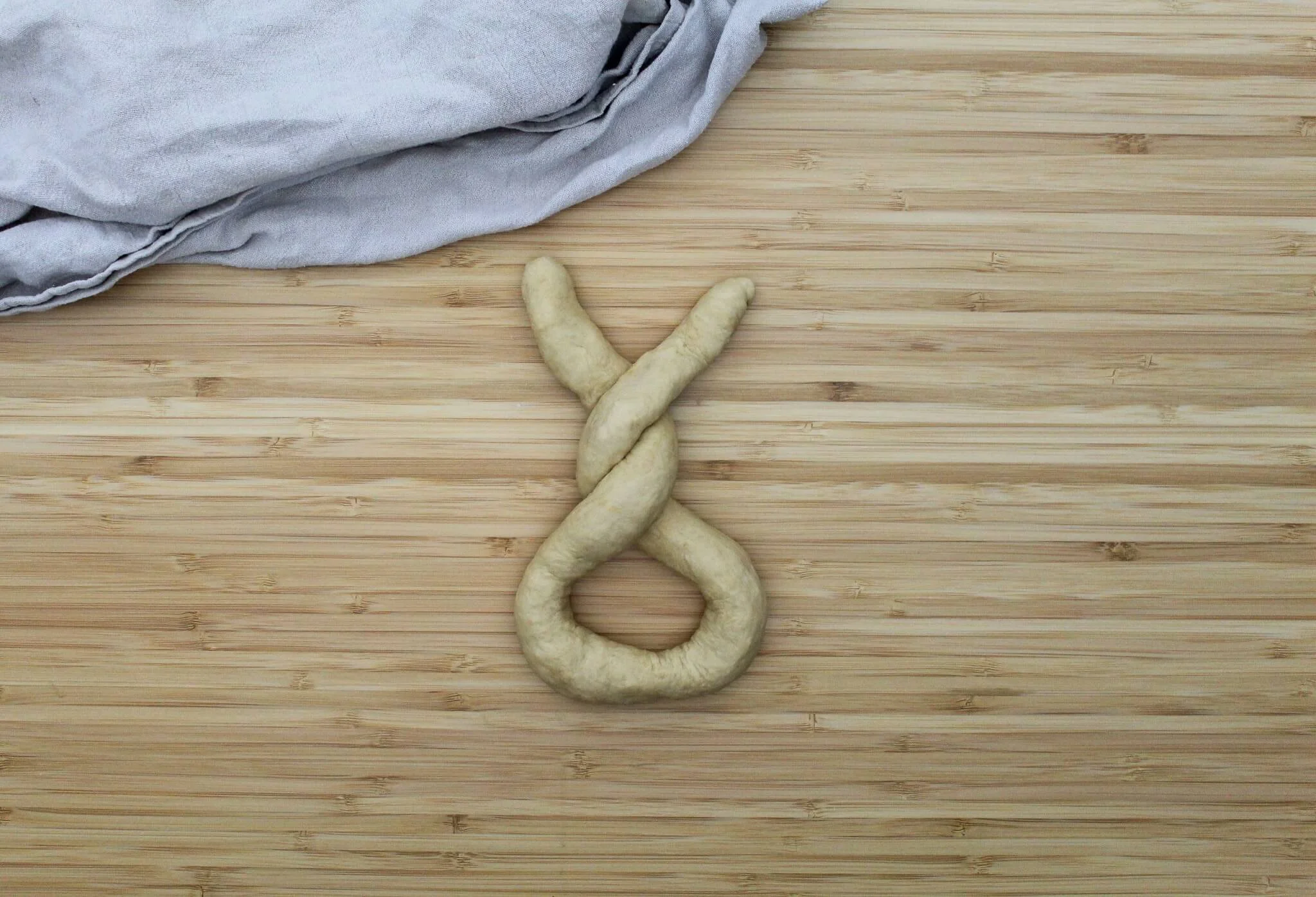 1: To shape the dough, first, take one piece of the dough and roll it out into a rope that is at least 20 inches long. You won't be able to get the full double twist unless it's at least that long. For more traditional shaped pretzels, make the rope longer, keep the middle thicker than the rest of the rope, and score the thick bottom once they're shaped.
