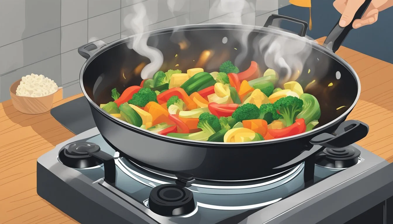 Efficiency in stir-frying vegetables can be achieved with a few strategic practices. One should start by cooking components that take the longest, such as brown rice, as it should be ready to serve with the stir fry. Using frozen vegetables is a time-saver and they should be added shortly after aromatic components like onions to ensure thorough heating through. To attain an even texture, they must cut their vegetables in uniform sizes for consistent cooking. For those preferring a sauce, combining liquids and corn starch in a separate bowl before adding it to the wok can prevent lumps and ensure even distribution.