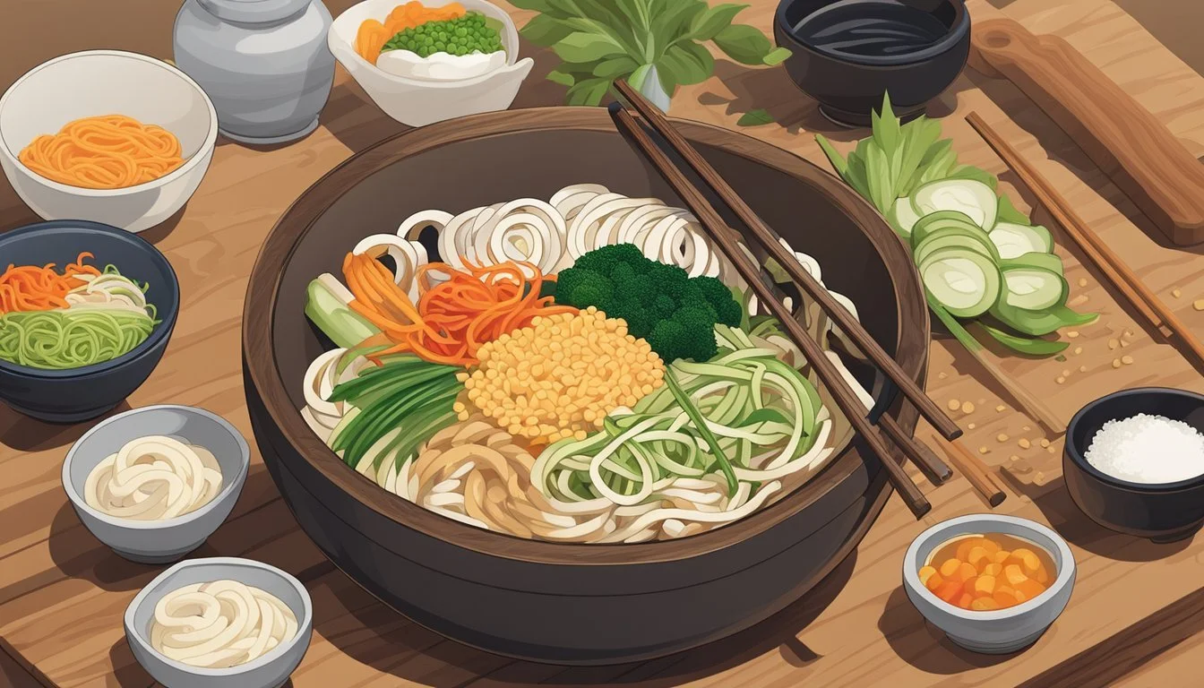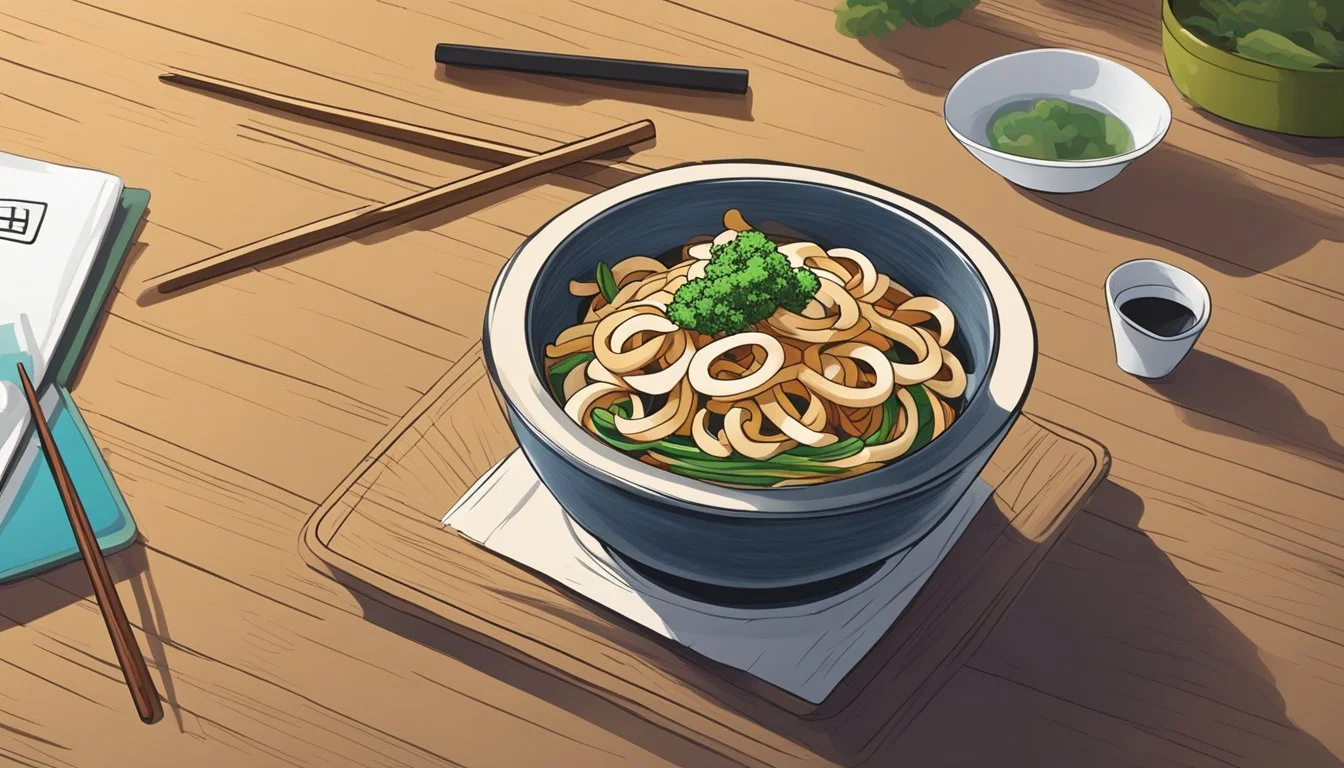 Udon noodles are the foundation of the dish and require careful attention. One begins by boiling water in a large pot until it reaches a rolling boil. They can either immerse fresh udon directly into this water or, if using dry udon, they should boil them for about 5 minutes until fully cooked. For frozen udon, it is common to blanch the noodles. After boiling, they should promptly drain the noodles to prevent overcooking. An alternative method includes heating a bowl of hot water in the microwave for about 2 minutes, then soaking the udon in the hot water for 1 minute to loosen them before draining.