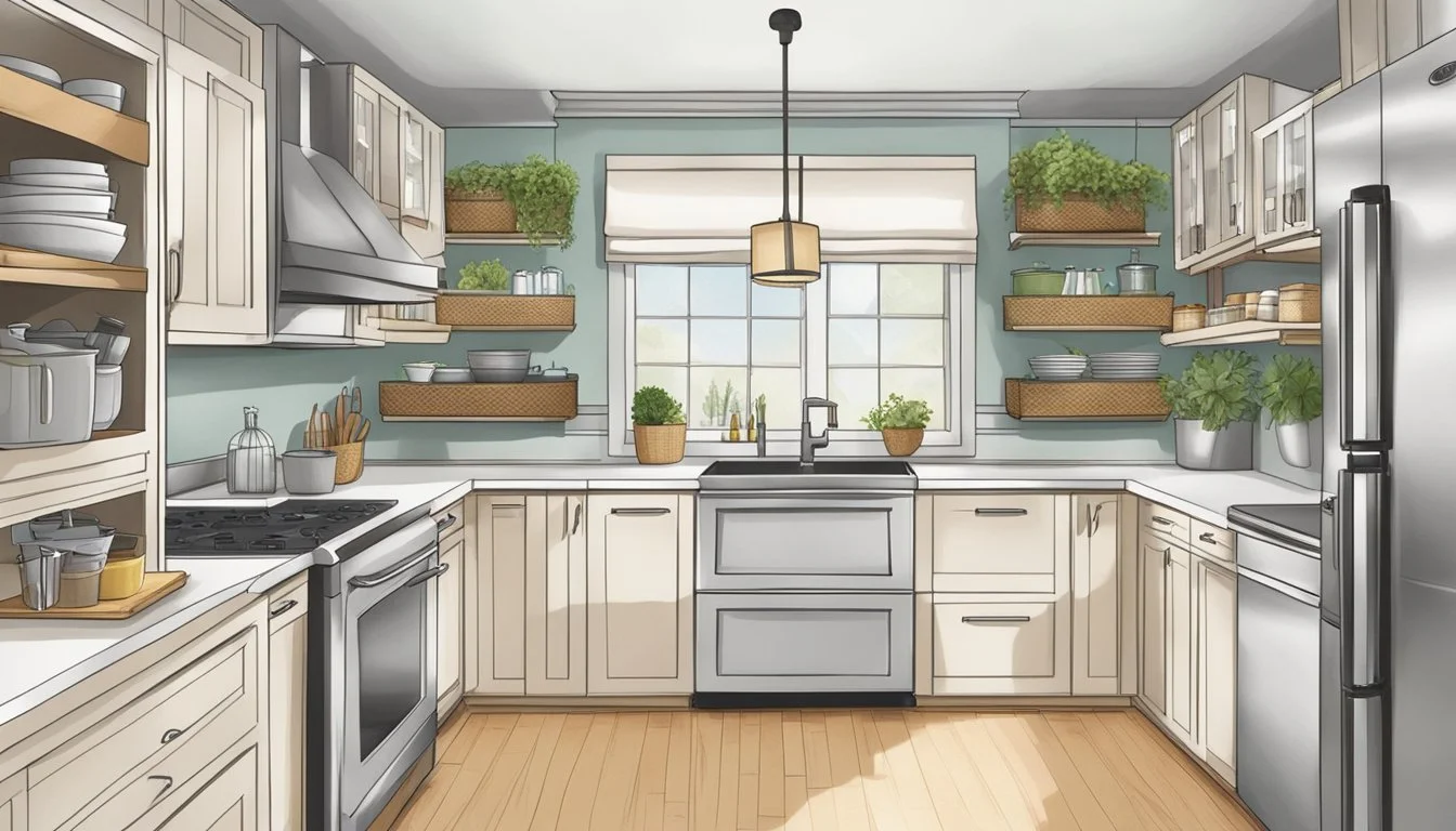 In addition to these, open shelving can house cooking utensils and spices, making it convenient to grab what's necessary without sifting through drawers. To integrate linens into this space, line one shelf with an attractive basket filled with neatly folded dish towels and stack cookbooks alongside for inspiration and quick reference during cooking.