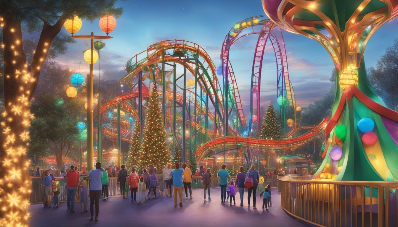 Six Flags transforms into a winter wonderland during the Holiday in the Park event, featuring twinkling light displays and thematic experiences with popular characters.
