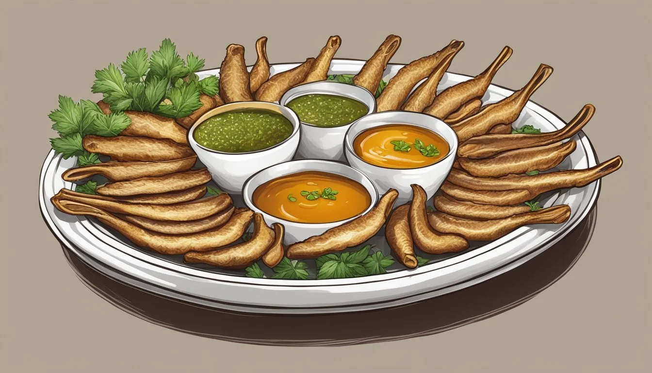 Duck tongues are typically served with a selection of dips and complemented by vegetables.