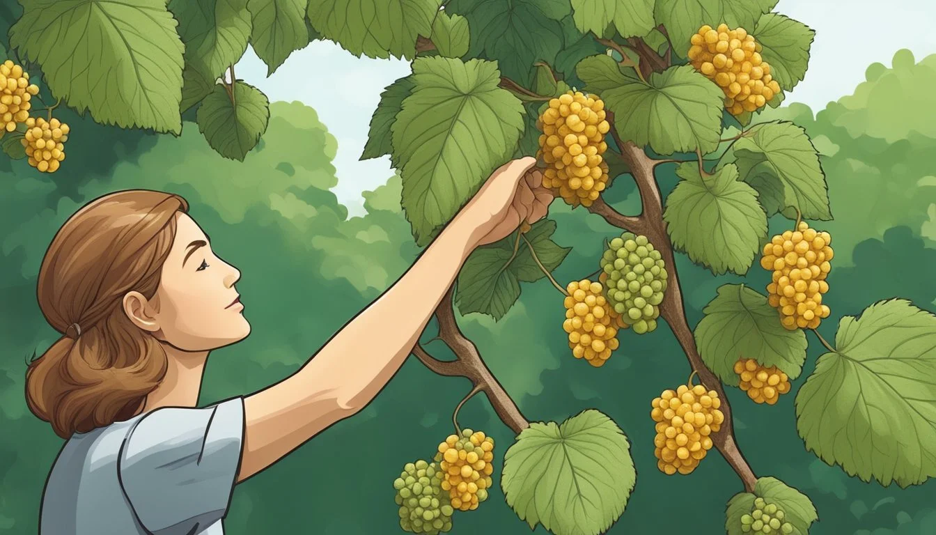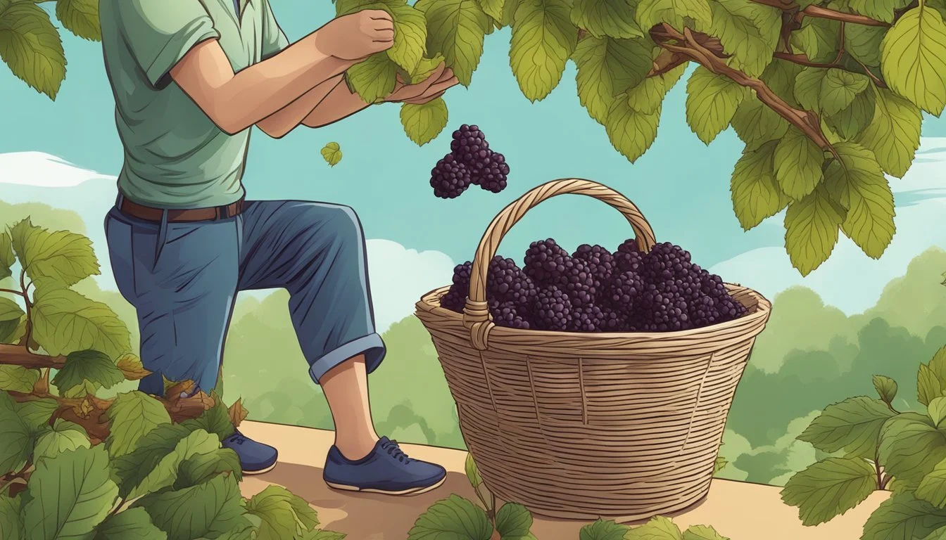 To use the Shaking Method, one should spread a clean tarp or sheet under the mulberry tree. This will catch berries as they fall. Gently shake the branches of the tree, causing ripe mulberries to loosen and drop. It's important to shake with controlled movements to prevent harming the tree and only harvest the ripest fruits. Gather the fallen berries from the tarp, ensuring they are free from debris before consumption or storage.